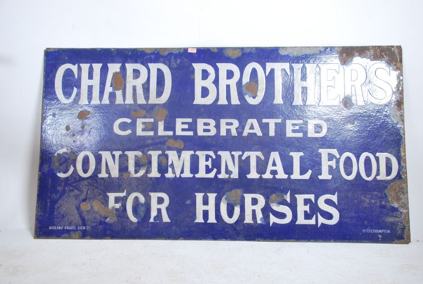 A large early 20th century Industrial enamel advertising sign for Chard Brothers ' CELEBRATED Condimental Food For Horses ' Good remains of colour, blue ground with white lettering. Measures 88cm high x 165cm.