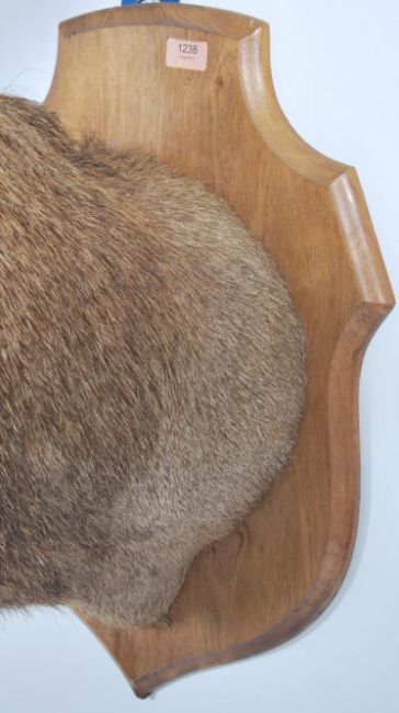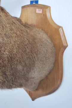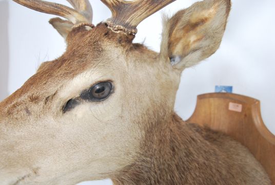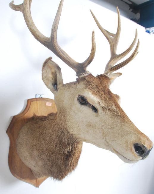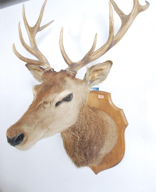 A large 20th century Taxidermy mounted Stag / deers head of adult large form being well presented with large antlers being set to an armorial oak plinth back with bracket. Measures 138cm high x 66cm wide and 78cm deep.