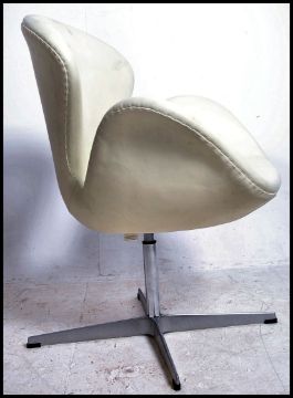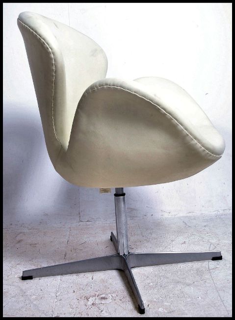 A fabulous Arne Jacobsen for Fritz Hansen style white / cream leather Swan chair - armchair. The original being designed in 1958, Raised on a four point steel base with fire label still in place. Measures 90cms high x  72cm wide x 57cms deep. Matching orange leather swan chair in lot 63