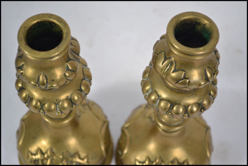 An unusual pair of believed 19th century candlesticks of tapering bulbous form depicting the Green Man with crown and notation for 1641