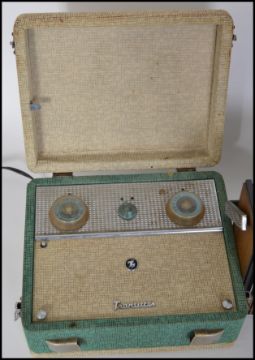 A vintage mid century retro HMV portable radio with teak facia together with a 1950's Transistor in 2 tone case and a Crown Solid State Transistor 14