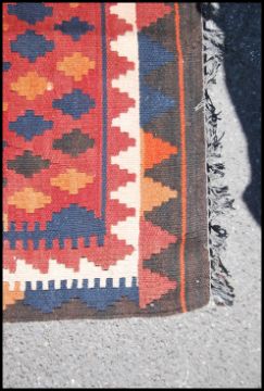 A pair of colourful Afghan handwoven  Maimana Kilim rugs having multiple diamond lozenge centre with geometric borders and tassled ends. Measures 82cms x98cms & 74cms x 98cms