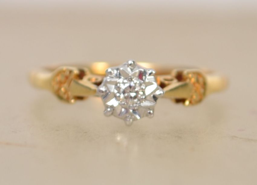 A hallmarked 18ct gold and diamond solitaire ring with illusion star set diamond in a pierced gallery. Hallmarked Birmingham. Weight 2.3g. Size K.5.