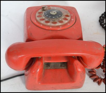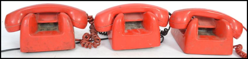 A group of three vintage retro 20th century industrial ring dial telephones in red with numerals to front and Arabic numerals underneath.