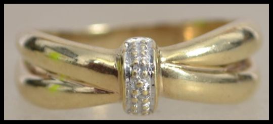 A hallmarked 9ct gold and diamond crossover band ring set with 2 illusion set diamonds.  Hallmarked import Birmingham. Weight 3.8g.  Size O.
