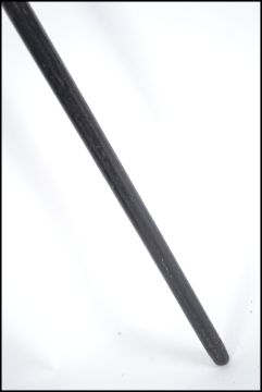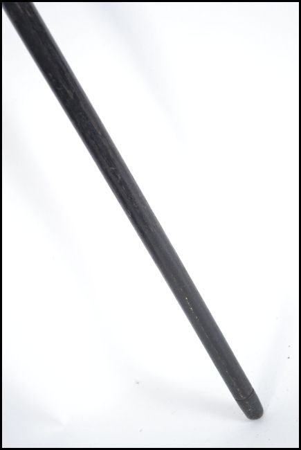 An early 20th century ebony walking stick cane having a shaped bone handle with hallmarked silver collar and top. Hallmarks for Birmingham 1912 John Howell.