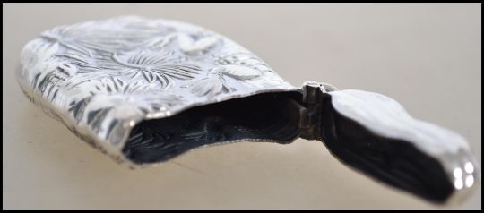 A silver contemporary vesta case having a hinged top with an embossed rococo case