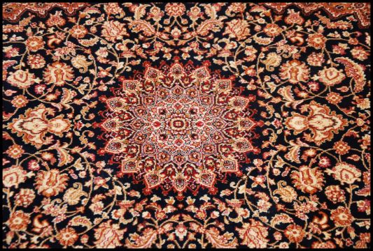 A large Iranian / Persian Keshan carpet - rug having blue and red ground with geometric decoration and borders. Measures 1.90m x 1.40m
