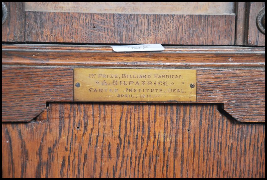An early 20th century oak cased mantel clock with an eight day movement set on a purpose built plinth and bearing a brass plaque with inscription ' 1st Prize Billiard Handicap Carter Institute Deal 1911 '. Measures 127cm High x 28cm Wide x 17cm Deep.