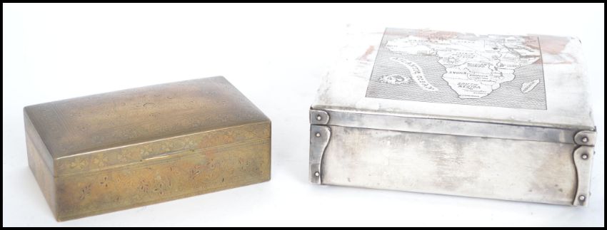 A fantastic early 20th century silver on copper table top cigarette box. The hinged chase decorated with a map of French Equatorial Africa featuring Rhodesia, Belgium Congo etc.