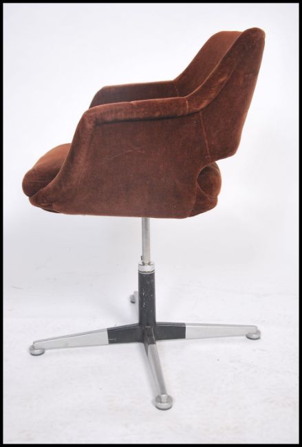 A 1970's retro 20th century office swivel chair being raised on a polished steel 4 point base being upholstered in the original brown felt fabric to the tub shaped chair. Measures 83 height x 64 width x 54 depth (cm)