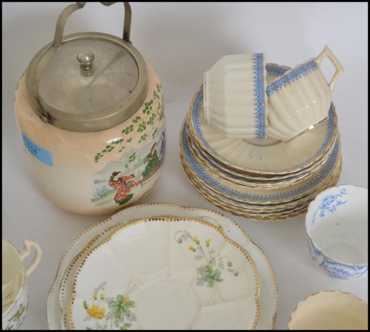 A late 19th / early 20th century chintzy bone China part tea service consisting of cups, saucers etc together with an early 20th century ceramic biscuit barrel.