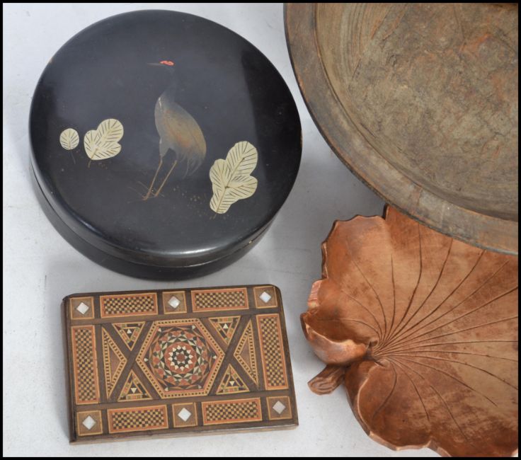 A good collection of vintage wooden and treen wares to include a turned wood bowl on tapering base, ebony lidded pots, a fantastic mother of pearl marquetry inlaid cigarette case, a pair of carved wooden bookends marked 1887 etc.