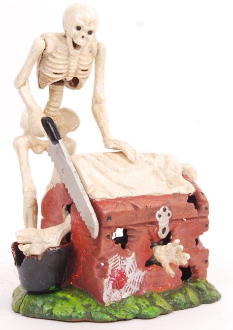 A cast iron clockwork Halloween style money box in the form of a skeleton executioner. The mechanism moving the saw, and the head falls into the basket. Hand painted.