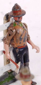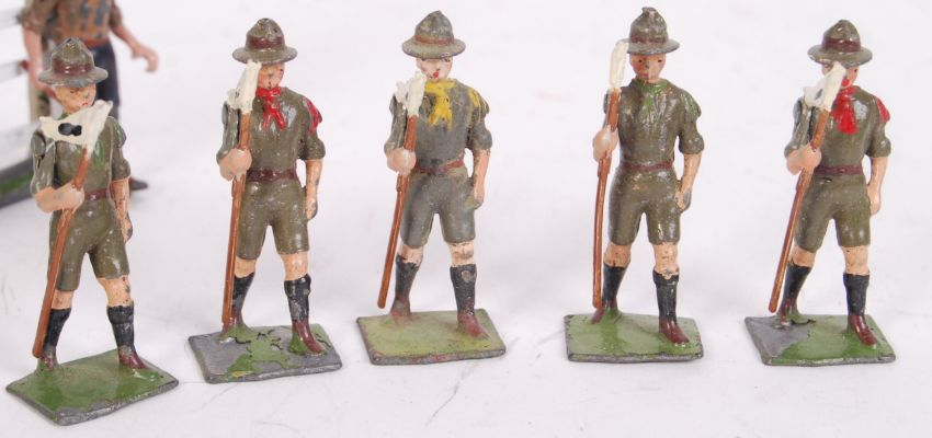 A collection of vintage Britians lead / hollow cast lead figures of Scouts. 5x with standards, and 3x with axes. Along with the Scout set tree and gate. All marked Britains to base. Rare figures.