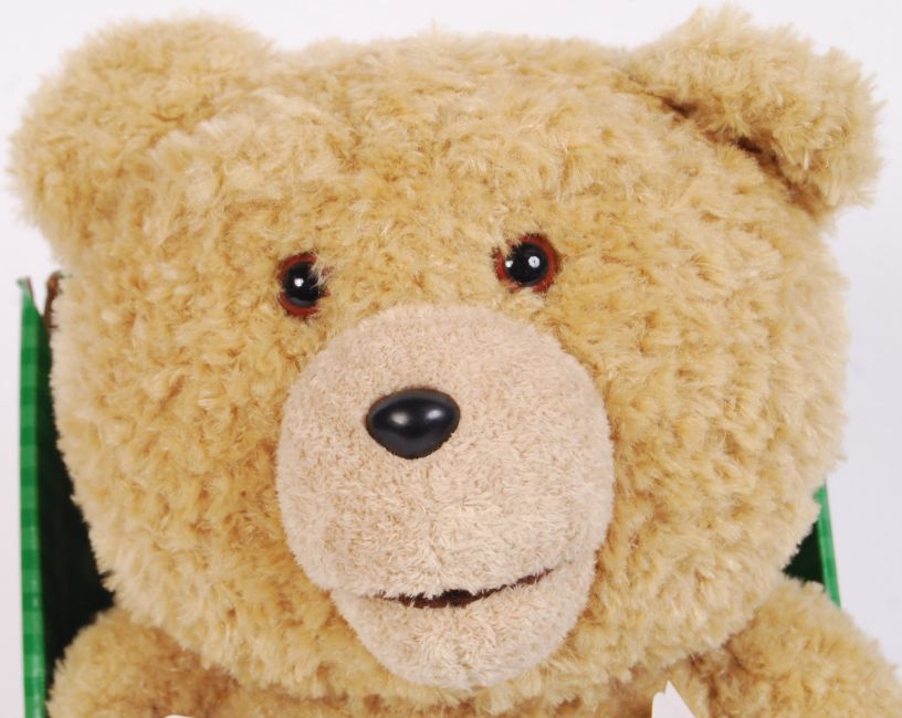 A Commonwealth Toys made 2012 ' Ted ' talking bear. Mint, and unused, within the original packaging. Working order with 12 different phrases and moving mouth. 38cm tall.
