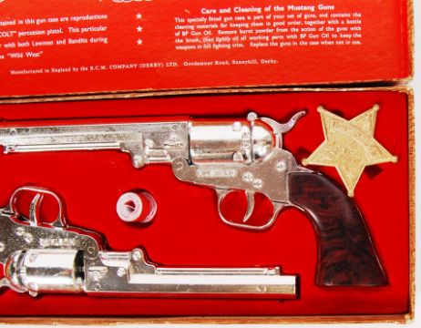 A rare original vintage 1960's BCM made ' Outlaw Mustang Presentation Case of Matching Cap 'n' Ball Pistols '. Cap pistols, within the original box. Appear complete, with caps, oil and badge. Rare.