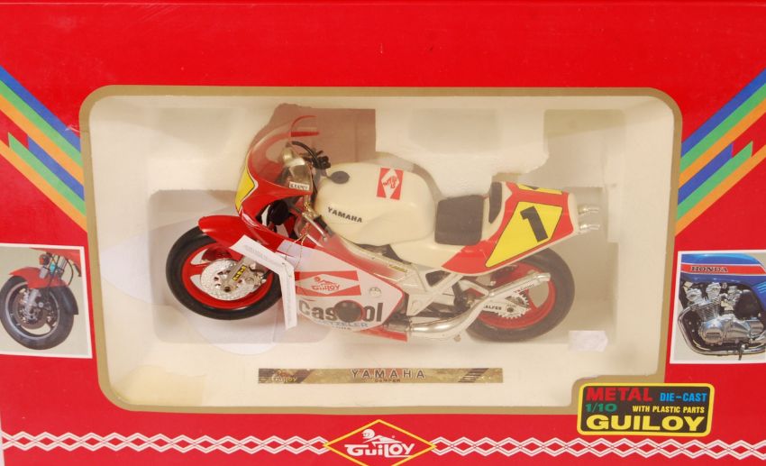 A collection of 4x precision detail 1:10 scale diecast model motorcycles, by Guiloy. All appear mint, within the original boxes (one box with split window). Comprising of; Cagiva 500cc, Yamaha Camper, Ducati 888 and Suzuki 500cc.