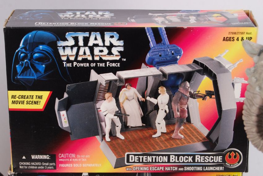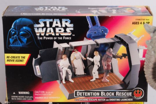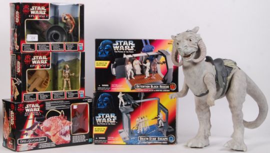 A collection of Star Wars action figure playsets and related toys. Comprising of 3x Star Wars Episode One Hasbro playsets (Gungan Assault Cannon, Armoured Scout Tank, Opee & Qui Gon Jinn), Two Kenner Power Of The Force sets (Detention Block Rescue and Death Star Escape - all unused) and a 12" scale Star Wars Taun Taun figure (unboxed).