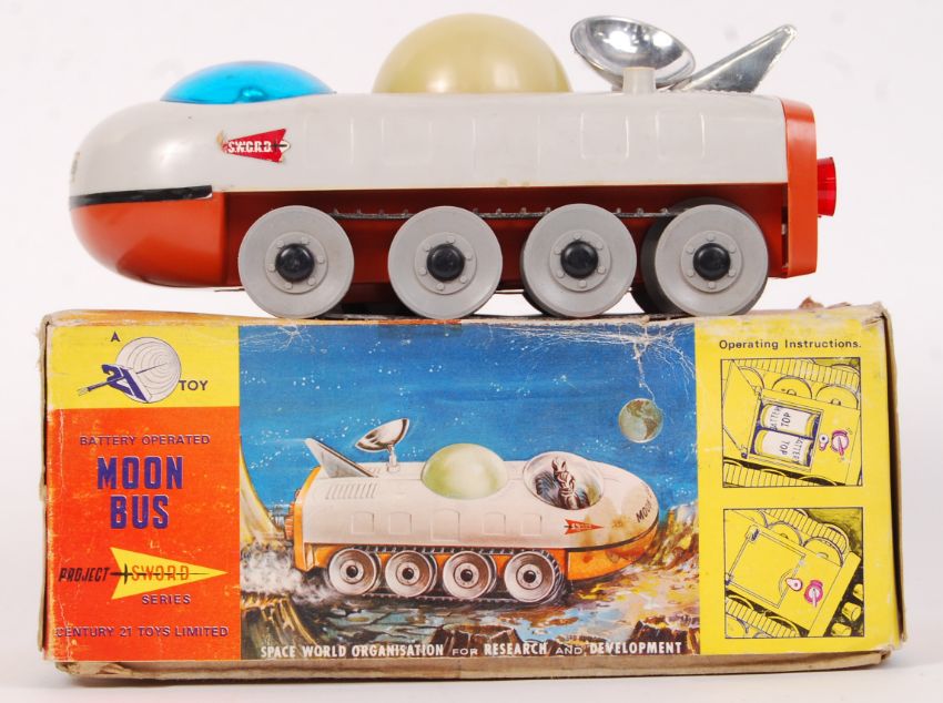 A rare Century 21 Toys Limited made Battery Operated ' Moon Bus ' plastic toy. Within the original box. Appears complete (satellite detached), with original rubber tracks to wheels. Original box AF.
