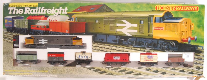 A vintage Hornby 00 gauge railway trainset R726 ' The Railfreight ' set. Appears largely complete (with loco, wagons and track etc) within the original box.