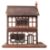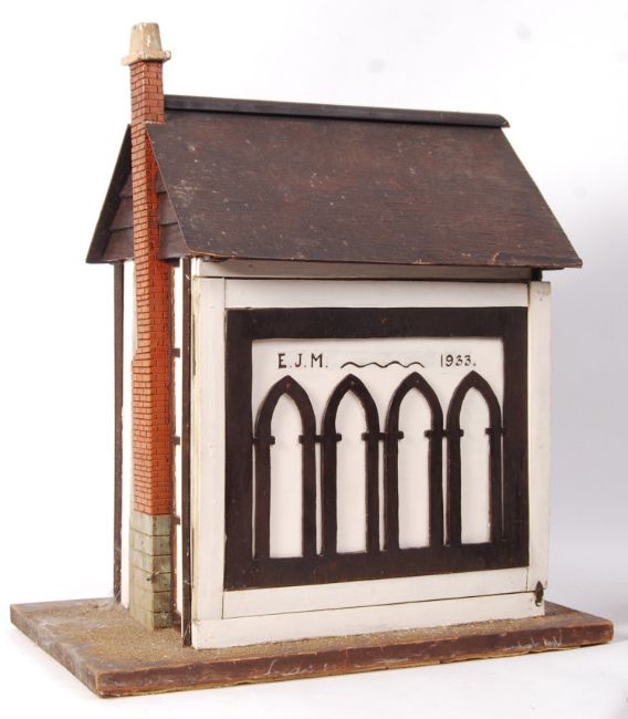 A vintage mid-century made wooden doll's house. Mock Tudor style, with opening rear panel, brick effect chimney and real glass windows. Comes furnished with a collection of period furniture. 60cm tall, the base being; 31x51cm.
