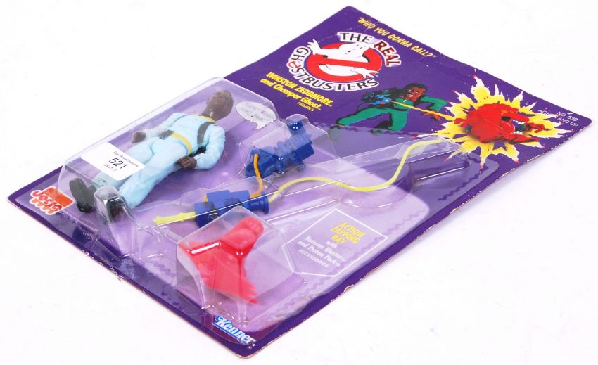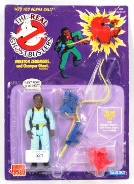 An original vintage retro Kenner The Real Ghostbusters carded first issue action figure ' Winston Zeddmore .' Carded, unused, on original card back. The card back unpunched.