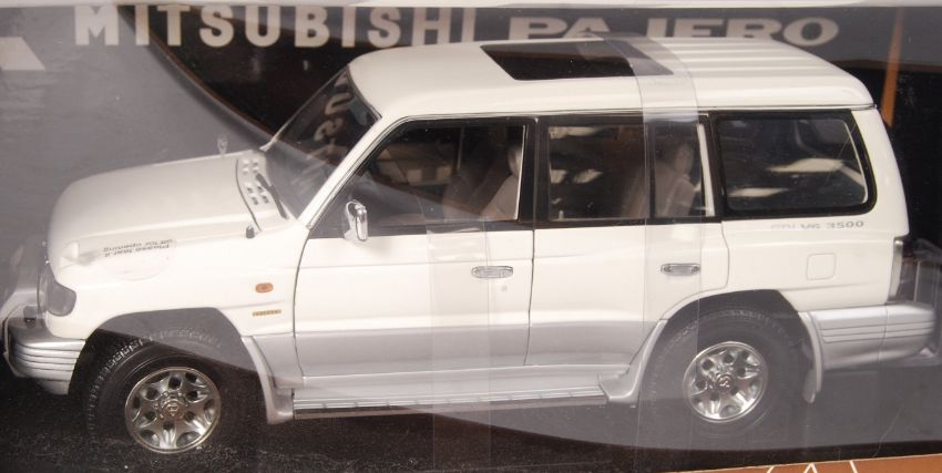 An Autoart 1:18 scale precision detail diecast model Mitsubishi Pajero in white. Model appears mint and unused, within the original display box.