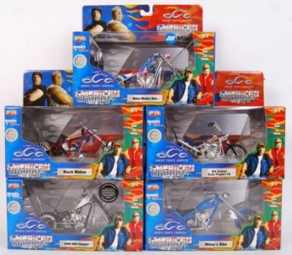 A collection of 5x original contemporary rcertl made Orange County Choppers 'American Chopper The Series' 1:18 scale diecast model motorbikes to include; Miller Welder Bike, POW/MIA Chopper, Black Widow, Old School Cody Project #2 & Mikey's Bike. All within their original boxes.