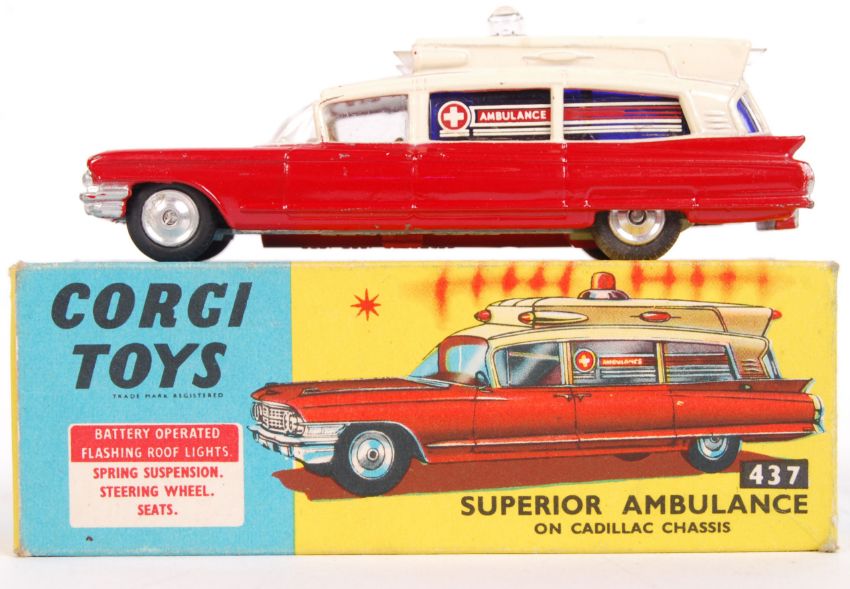 An original vintage Corgi Toys diecast model 437 Superior Ambulance. Red, with cream top section. Appears near mint, within a very good original box.