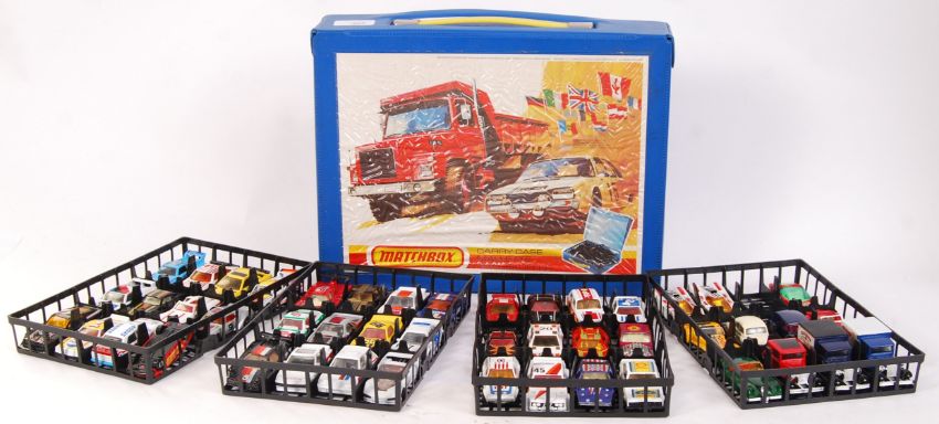 A good vintage Matchbox vinyl Carry Case, filled with largely mint to mint+ condition loose Matchbox diecast models. Various series to include Superfast, and others. All cars / road vehicles.