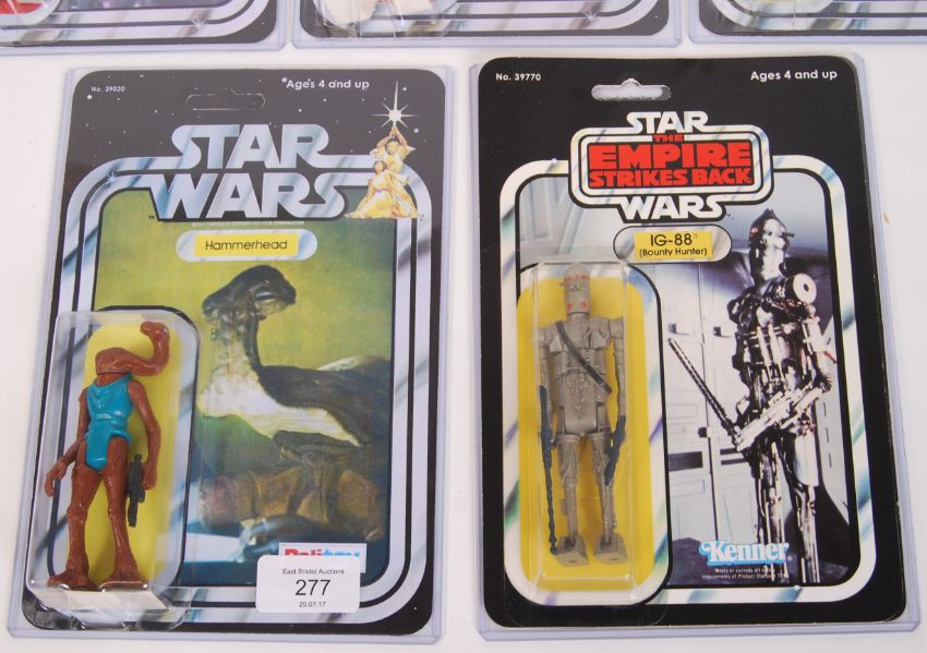 A collection of 5x Star Wars vintage Kenner / Palitoy action figures, all mounted for display with reproduction backing cards. Comprising of; Snaggletooth, Boba Fett, Death Star Droid, Hammerhead, and IG88.