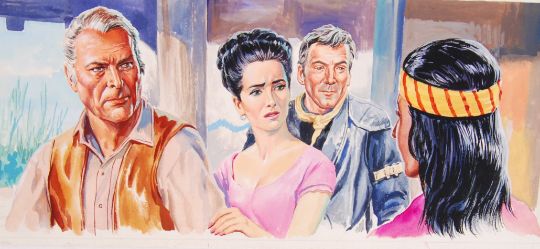An original vintage 1960's / 1970's panel of artwork from the High Chaparral children's annual. Depicting a scene of four characters outside a homestead. Measures approx; 13cm x 41cm