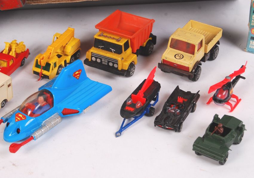A large collection of assorted loose vintage diecast model cars. To include Corgi, Dinky, Matchbox, Lesney, Corgi Chipperfields, Corgi Juniors Batmobile and others. Along with 2x Matchbox 75 Series boxed models (16 & 50) and a Matchbox Super Kings boxed K-22 Hovercraft.
