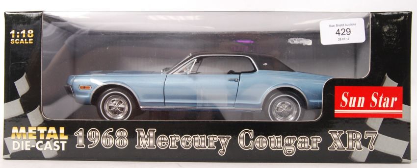 A Sun Star made 1:18 scale precision diecast model 1968 Mercury Cougar XR7 in blue. Appears mint and unused, within the original display box.