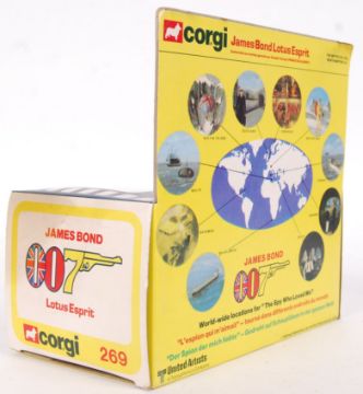 An incredible ex-shop-stock Corgi James Bond 007 diecast model No. 269 ' Lotus Esprit .' Model appears to have never been removed from the box, and thus survives in mint+ condition. All rockets remain unremoved from their plastic sprues. Within a very near mint original box (minor crumpling of the plastic, light storage wear). The rear box flap never having been folded. Rare in this condition.
