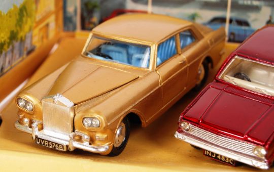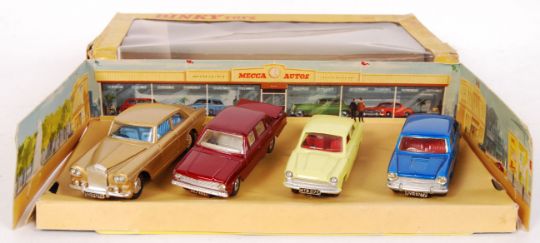 A rare original vintage Dinky Toys diecast model Presentation Set No. 126 ' Motor Show Set .' Comprising of models; No.127 Rolls Royce, 159 Cortina, 151 Vauxhall Victor and 171 Austin 1800. All models appear mint or mint+ in condition. The set complete with backing card, stand and original box. Outer box being fair (6.5/10). A rare Dinky gift set.