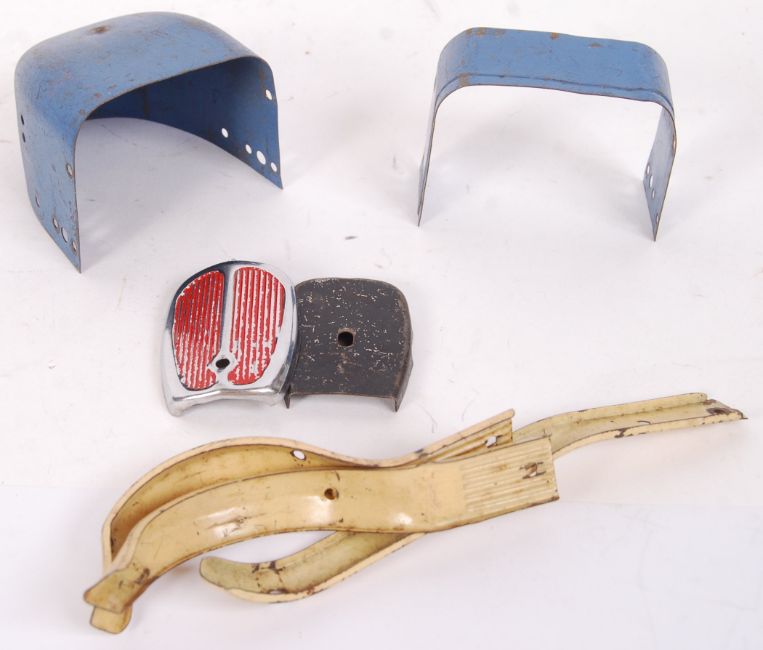 A rare c1930's early Meccano ' Motor Car Constructor Set No. 2 ' car. In blue, with cream wings. Meccano stamp to rear section, with original tinplate seats. Along with a quantity of extras to include a different shaped rear section, an engine cowl, radiator and wings. Measuring approx; 31cm long.  Condition; generally acceptable for a 1930's metal toy. Metal fatigue to all wheels (one wheel loose), one headlight missing. Otherwise appears complete. Surface rusting all over, cosmetic wear and tear. The body is structurally good. Clockwork mechanism works (with a little help). No key. A rare example of an early Meccano car.