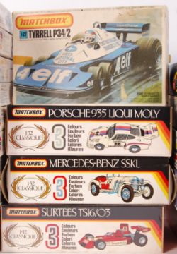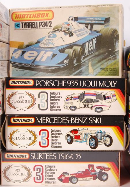 A quantity of 1:32 scale original Airfix & Matchbox transport related model kits to include; Historica Cars collection Aston Martin DB5, Bugatti 35B, Bugatti 35B, MGB, MGB, Mercedes, Bentley & Matchbox Mercedes Benz SSKL, Porsche 935, Surtees TS16 & others. All within their original boxes with a collection in sealed within their boxes.