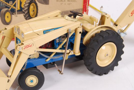 A rare vintage tinplate Cragston Corp made ' 4000 Industrial Tractor Diesel ' toy. Complete, within the original box (with card insert tray). Tin plate and plastic construction. Cream and blue livery, with all original plaques fitted. Real rubber tyres and working mechanism. Appears complete, and generally good condition. Within the original box (box with restoration). 1:10 scale.