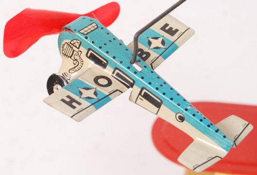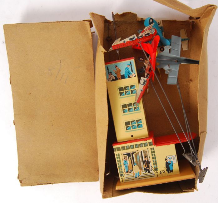 A vintage 1950's 'Made In Western Germany ' tinplate clockwork Flight Tower. Complete, with all four planes. No key present. Within its original buff un-labelled box. Turning the key makes the planes spin in opposite directions and the propellers spin. Approx 28cm tall.