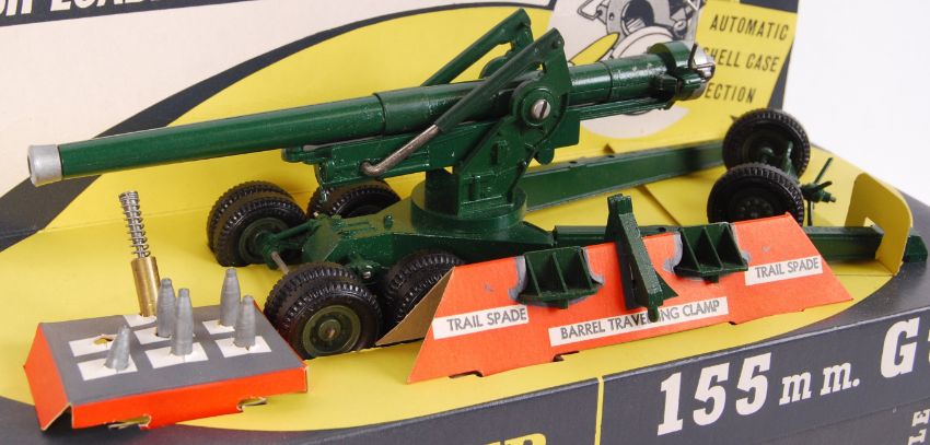 An original vintage Britains Ltd ' 155mm Gun ' 9745 model. Within the original box, with presentation display stand. With 'Breech loading Cartridge Ejected Shells' feature. Largely complete (missing one plastic shell). Working order. Appears near mint to very near mint.