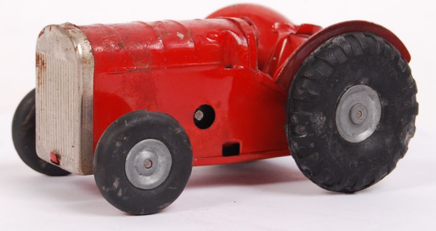 An original vintage charming Triang Minic Toys clockwork tinplate farm tractor. Working order, with Triang key. Red, with original black tyres.