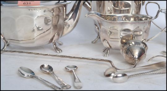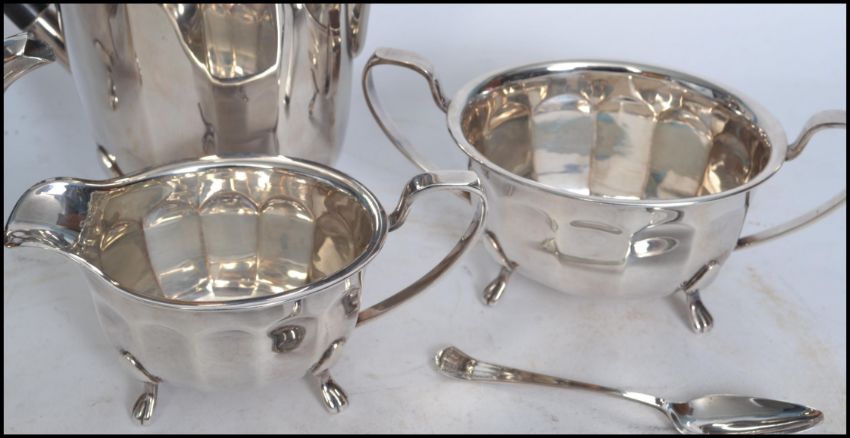 A four piece Sheffield silver plate tea service having ebonised handles along with a collection of silver plated spoons and a silver plated candle snuffer of elongated form. Measures teapot 22cms high.