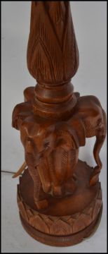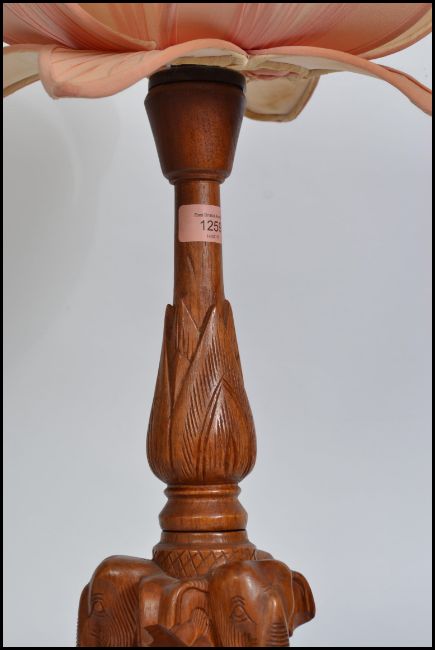 A  mid century Chinese lotus flower lamp having carved hardwood base in the form of elephants having an articulated wooden flower leaf shade