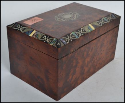 A 19th century Regency yew wood and abalone tea caddy of square form having a hinged top with abalone detailing. The hinged top enclosing sectional interior