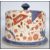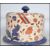 A large 19th century Staffordshire Imari pattern cheese dish and stand. The cover with finial handle. Underside of stamp with illegible marks. Measures: 20cm high x 25cms diam