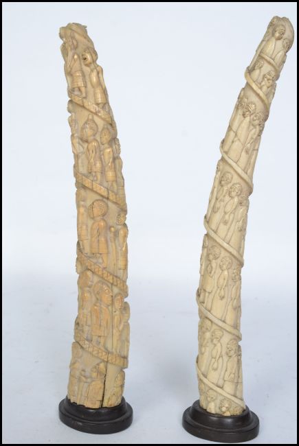 A stunning pair of 19th century Loango - Congolese carved ivory tusks with seven tiers of figures and animals. Each raised on hardwood socle plinths ( see illustrations )