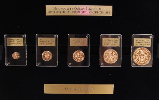 An incredible London Mint Office issued ' Her Majesty Queen Elizabeth II 90th Birthday Piedfort Sovereign Set .' Comprising of the following proof Gibraltar issued sovereigns; Five Sovereign (22ct, 79.88g), Double Sovereign (22ct, 37.96g), Full Sovereign (22ct, 15.96), Quarter Sovereign (22ct, 3.98g), and a Half Sovereign (22ct, 7.98g). Within the deluxe dual-layered presentation case. With all certificates and related paperwork. Total coin weight; 145.76g.