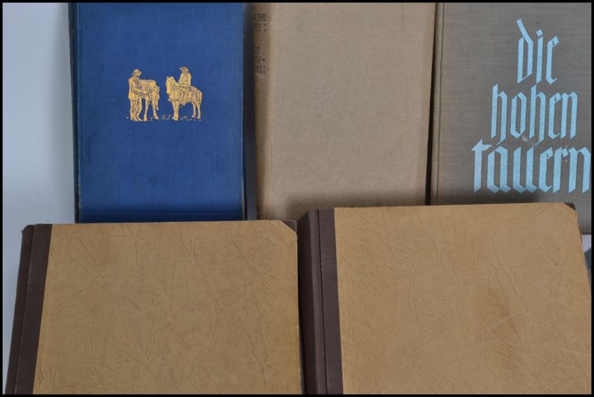 A collection of exploration / mountaineering related books, to include; Up The Amazon Over the Andes (1932), The Wilds Of Maoriland (Bell, 1914), Characteristics Of Existing Glaciers (1911), A Norwegian Traveller In Tibet (1973), Die Hohen Tauren (1935), New Zealand Scenery (First Edition) and others. Approx 15. Measures: 31cm wide.
